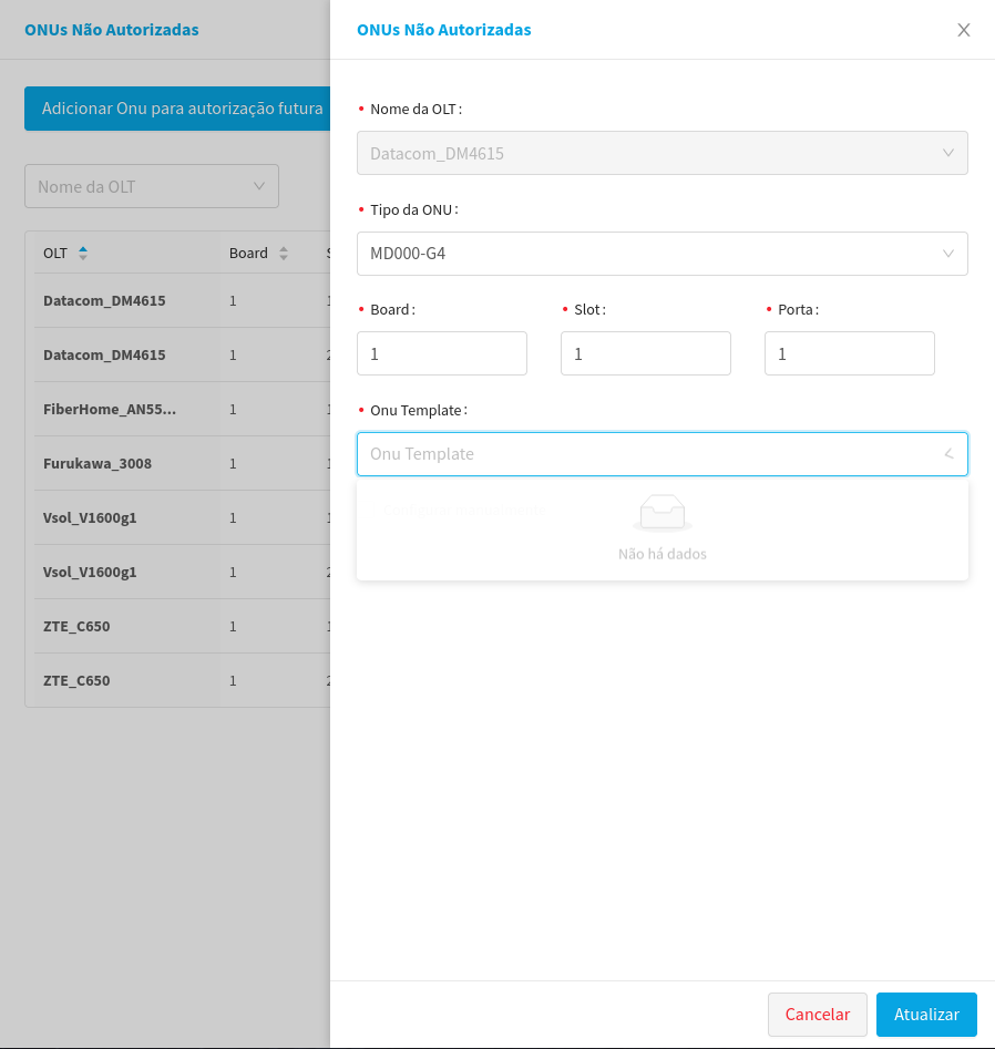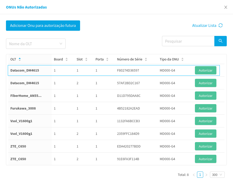 - Since we created a template in OLT Datacom_DM4615, we will select an ONU linked to that olt, in this case, we will click on Authorize at the first UN listed.