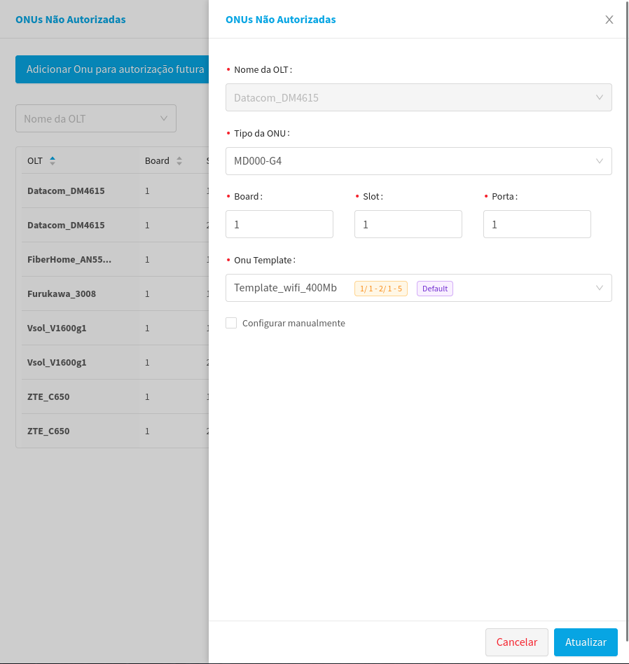 - When selecting the template and clicking update in the lower right corner, the UN will be enabled and will be moved to the authorized ONUs screen, with the data of the selected template.